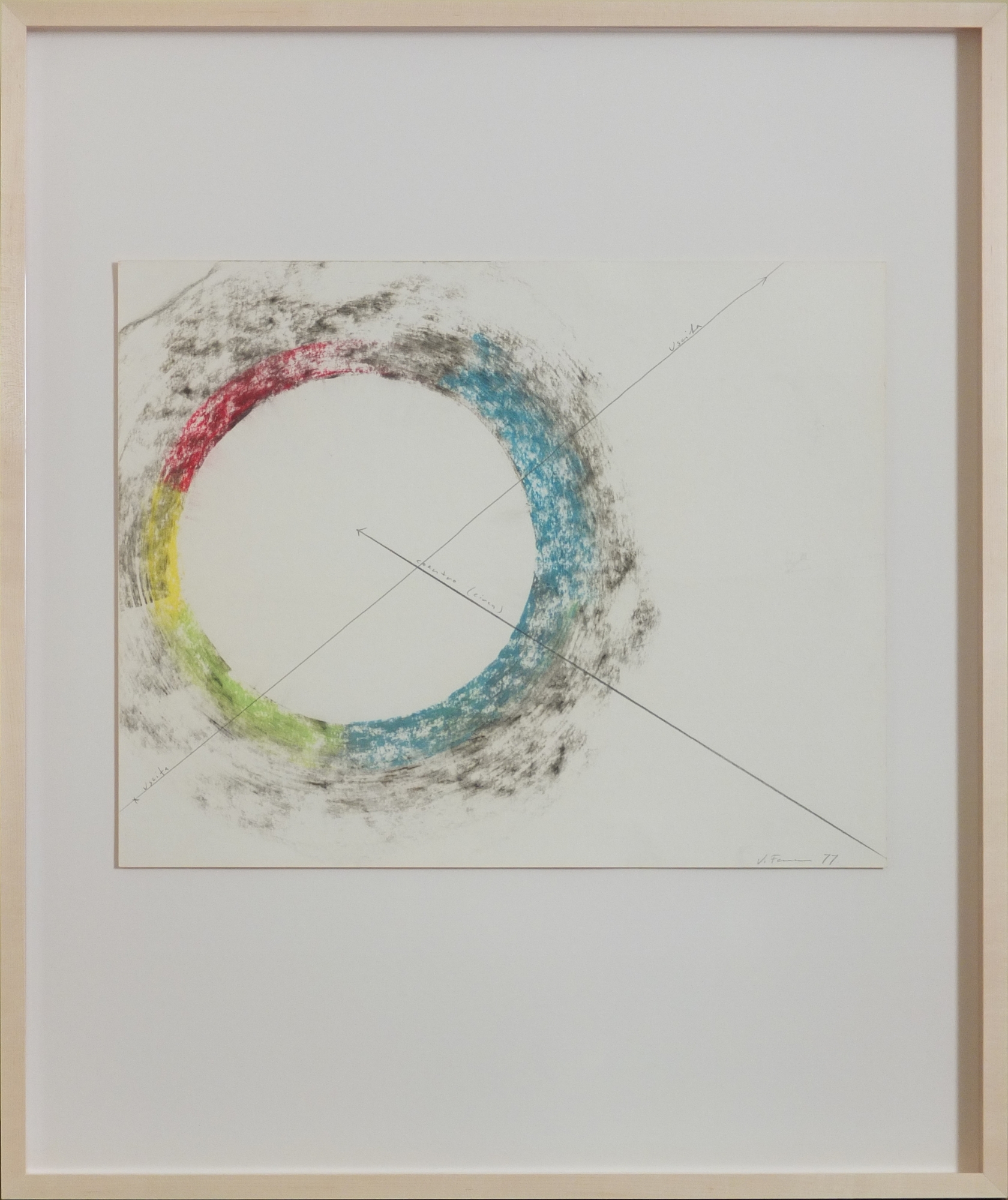 As far as I know, most of Mr. Ferrari’s sculptures during the period of the drawings are generally of a single material (metal or stone), or sometimes two contrasting materials—in either case, with the natural hues of the materials honored—monochromatic and hard. Thus, the drawings, with their polychromatic strokes, whether signifying levity or profundity, are a surprise and a revelation. They suggest to me that perhaps within the stark materials and finishes candidly exposed in the works of the period, there were also deeply imbued inner voices, and purely imaged gestures of color, for us to conceptualize and perceive on our own.