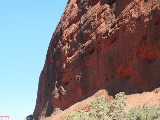 All of the pits and grooves and surface features are naturally produced by wind and water erosion, and the vertical black streaks are lichen and other plant matter that remain when waterfalls, formed by the few yearly torrential downpours, dry up. You will see more of these waterfall residuals in pictures of Uluṟu.