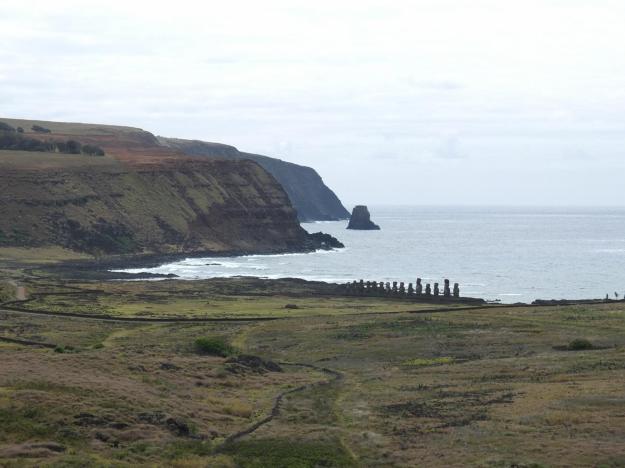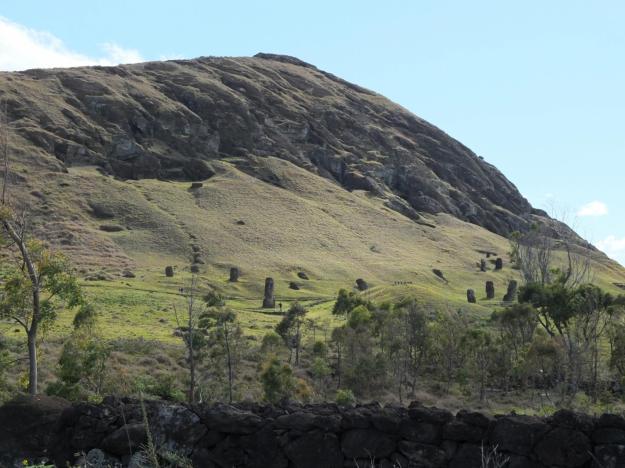 Here’s a view from the quarry to the famous Tongariki site, with its fifteen Moai, a little less than a mile down toward the south-eastern coast of the island (we’ll see these closer up shortly, when we go and visit that site).