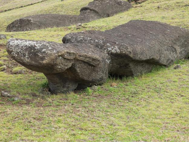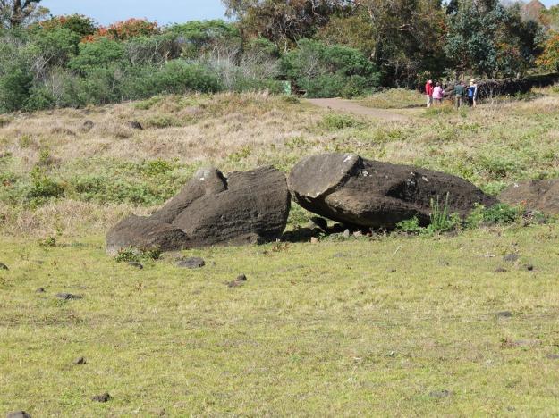 Ironically, many of the Moai that were installed on various ahus and then knocked over, also lost their heads, but archaeologists re-attached the heads with steel bars and cement in resurrecting them. The damaged ones here at quarry are clearly going to be left as they are, to freeze in time the moment that the work stopped in the construction of the Moai (and not the moment of their later destruction).