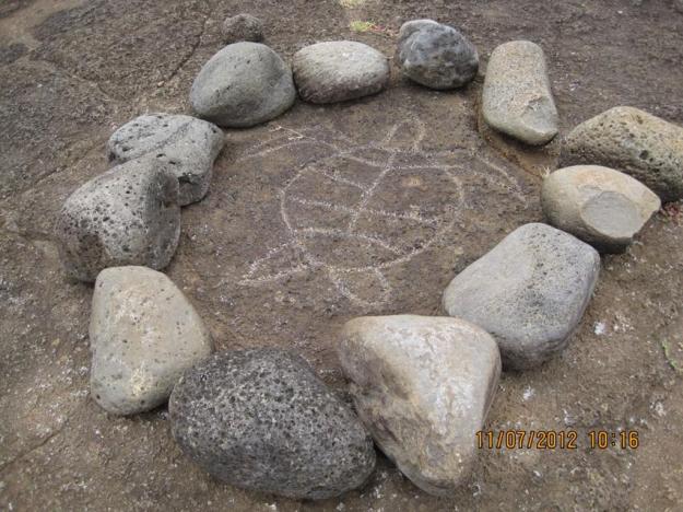 Note the ring of rocks on the lower left-hand side, they guard a flat surface on which the petroglyph of a turtle was carved. Here’s a picture of the glyph from Mom’s camera: