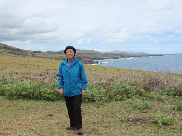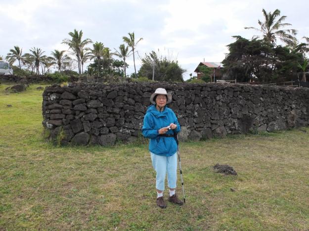 In addition to the statues, the Rapa Nui people of the island also built many stone houses and walls, as well as co-opting caves in which to live (or stay for extended ceremonies, or sometimes seasons). Many of the houses were partially underground, with low entrances into the tight spaces; it’s hard to image how they could possibly live within them. Here is Mom standing next to a wall at the site. Note the relatively primitive construction, at least compared with the Incas (more on that later).