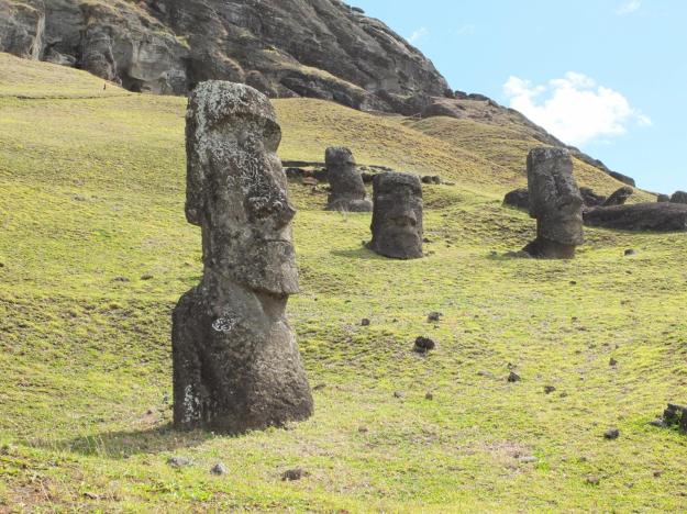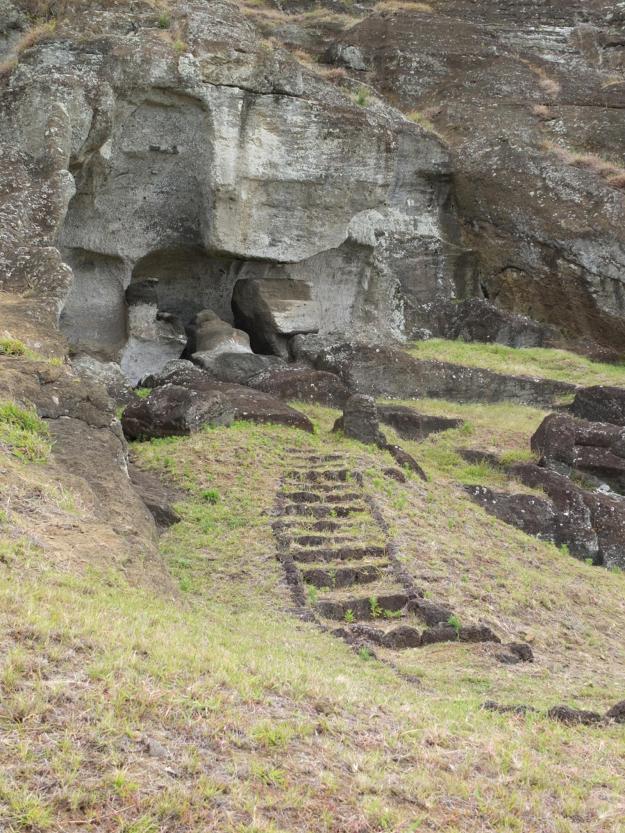 And here’s a view of a statue midway during the carving process. As Michelangelo would say, the Moai is already lying on its back fully formed within the rock, and the Rapa Nui just have to carve out the stone around it.