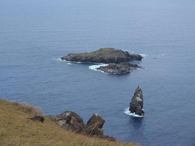 The other significant element of the Bird Man Cult ritual was the group of small rocky islets off the south-west coast of Easter Island itself, just opposite Orongo, consisting of two mostly flat (and barely occupiable) islets (a larger one and a smaller one), as well as a precipitous (not “precipitate”) rock spire thrusting up from the water, half-way between the occupiable islets and the main island.