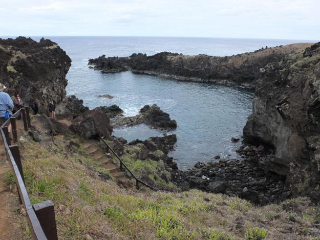The crater appears nearly perfectly round, with an intact superscribed ring several hundred feet above the bottom of the caldera, above which are exposed rock outcroppings like castle turrets, and larger sheer rock slip planes like lookout towers. During periods of drought on the island, this was one of the few sources of fresh water; the natives carved steps down to the bottom, where they could collect the rainwater that had been trapped (not reabsorbing into the ground here).