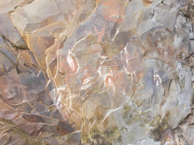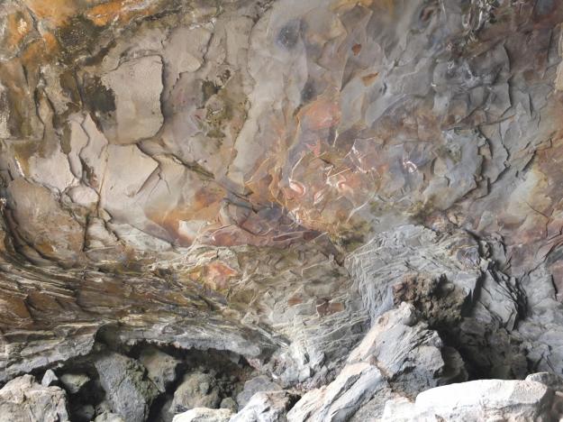 When the waves come in, they break in lively sprays of white foam over the small ring of rocks on the left-hand side of the inlet (center of the picture). We climbed down the set of stone steps and entered the cave, which is rocky and uneven and really quite shallow, and this is what we saw when we looked up at the ceiling: