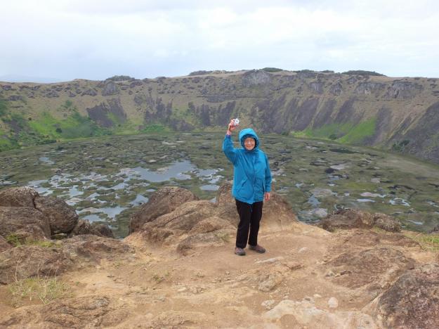 After lunch, we took a full group trip to the ancient village of Orongo, which was right next to the Rano Kau caldera, and the center of activity for the Bird Man Cult (which you can read about on wikipedia, among other places, though there is much varying information and interpretation of exactly how the politics and succession worked on the island—perhaps the true story can only be known through an old man’s dreaming). Here is Mom clowning it up a little on the edge of the spectacular caldera, close to Orongo Village (we had climbed up to the far opposite side in the morning):
