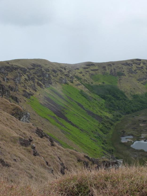 We hiked along the rim for a while, until we had to turn around to make it back in time for packing and lunch. Not super-strenuous, but a good way to take in more of the open island air and see the sights from a different vantage point. Later that afternoon, we would come back to the same volcano, but on the opposite side of the caldera (when visiting the site of Orongo Village); I’ll show pictures of the crater from that site visit.
