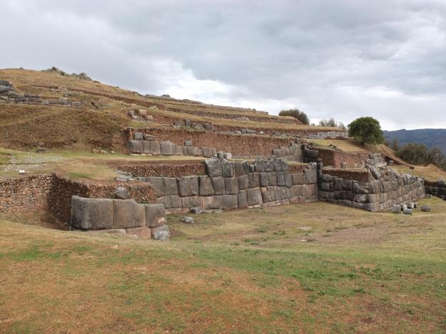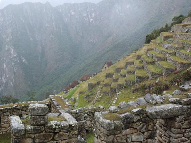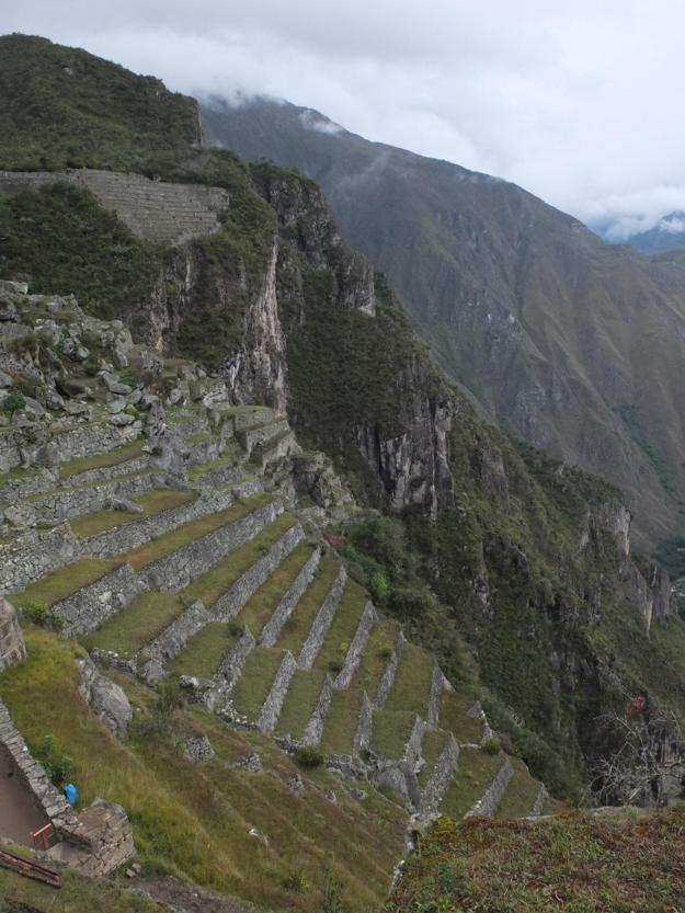 Just below the quarry is more terracing, presumably used to shore up the mountainside to prevent slides and deterioration. I don’t know if these terraces were also used for agriculture, but it wouldn’t be surprised if they were, given the enterprise and clear boldness of the people, despite the utter steepness of the terrain. Just beyond the terraces, you can see the type of terrain from which they were constructed. You have to let your imagination flow after taking in all of the information at the site—both details and panorama—to try and picture how they built the place and how they lived; the effect can be absolutely stupefying.