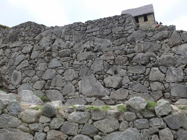 In the agricultural parts of the site, outside of the gated city walls, the terraces are broader and were farmable by the people at the time (though it is still incredible to imagine it when you see it). There were cantilevered steps jutting out from the end walls, some of which still survive, which would be sticking out straight toward you in this photo. Oh yeah, and there are llamas.