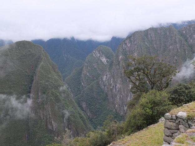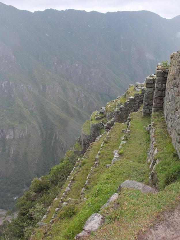 The mountain on which the citadel is perched has sheer walls on all sides. The city and the agricultural terraces are situated between two peaks, Machu Picchu (“old peak”) and Huayna Picchu (“young peak”). Three is also a smaller peak situated to the left of Huayna Picchu (looking from the site), I don’t know the name, but we have dubbed it “Baby Picchu”. Baby Picchu is visible in almost all views that include its big brother Huayna Picchu.