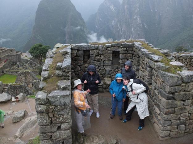 At the start of the tour, they were sending us off twelve at a time with a guide; we were the last group to get rolling, with a headcount of just six. One guy was not feeling well a little ways in and went back to the Sanctuary Lodge just outside the entrance to the site (the premiere place to stay if doing a multi-day visit) to recover, leaving us with just five and our guide, Dagmar (on the left). Dagmar was great. Those non-open openings that look like boarded up windows are actually storage alcoves. The peak in the background to the left is the same as the first one posted above (across the river and the train tracks from the site), I don’t know its name.