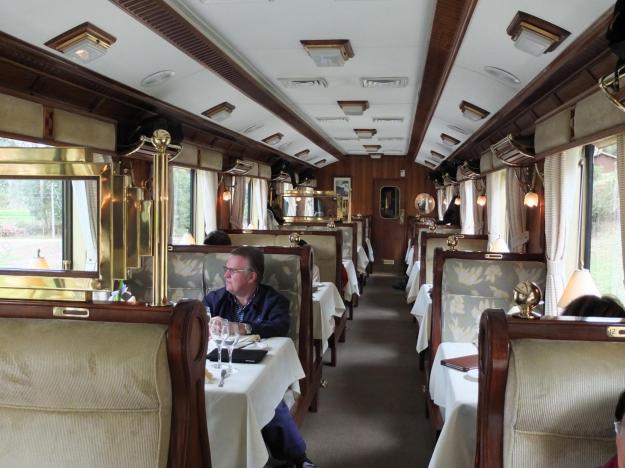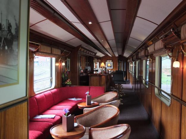 Beautiful wood and total attention to detail in the furniture and hardware and table settings and absolutely everything else. Mom and I had a table for two on the right side of the train, this was our home base for the journey. There were also two bar/lounge cars toward the rear of the train, they look like this: