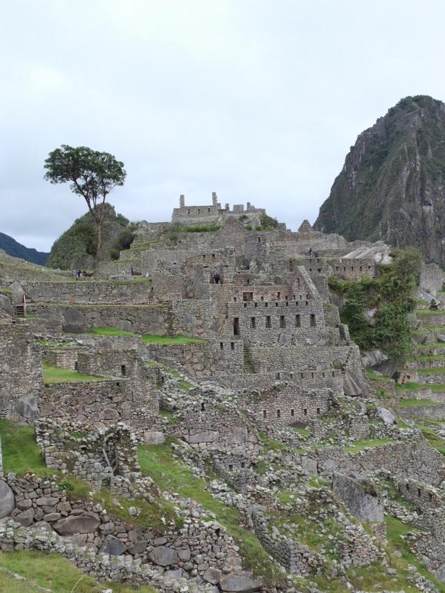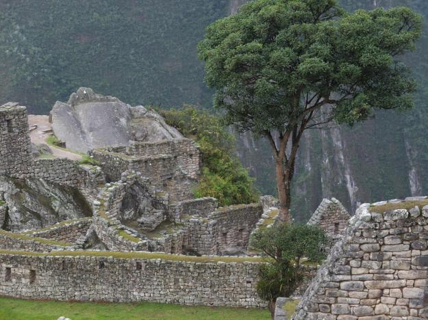 The big tree in the shot is a very prominent presence in the large plaza lawn, which is otherwise complete flat and featureless. The tree is actually not from Incan times, but rather the accidental growth from a wooden stake used for marking a location, evidently still green, and left during earlier archaeological work in the 1930s or 1940s. It is now a trademark element of the site, but has nothing to do with the Incas who built the site.