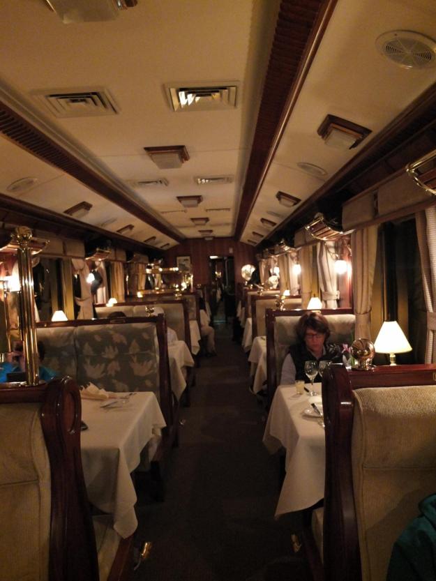 And the second: after a nicely prepared dinner onboard the train, accompanied by decent South American wine and the lively banter of fulfillment among the members of the tour, this captures the wind down to a tranquil and nearly silent end of the ride back to Cusco, in our magnificent carriage.